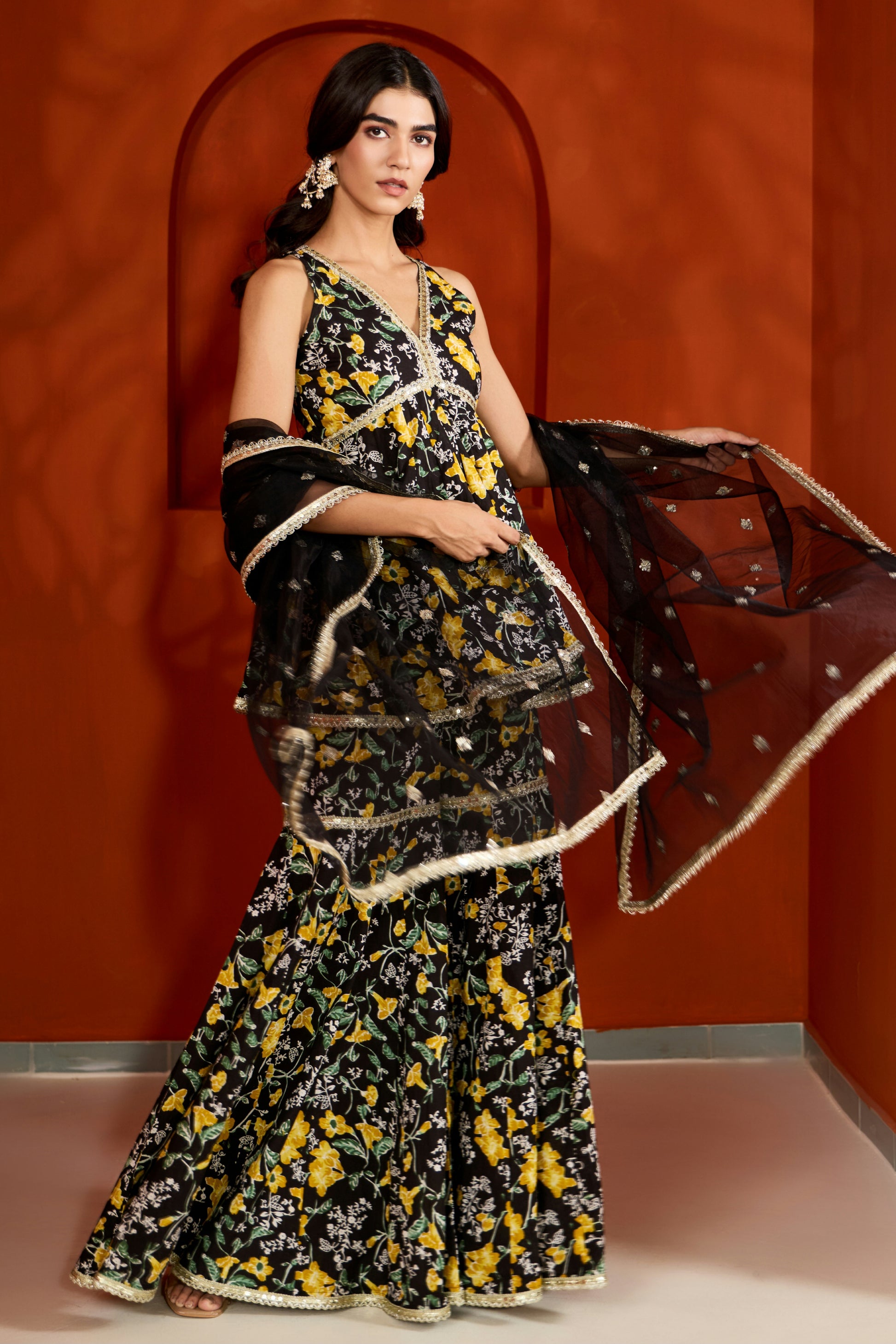 - Printed Short kurta with Sharara & Dupatta