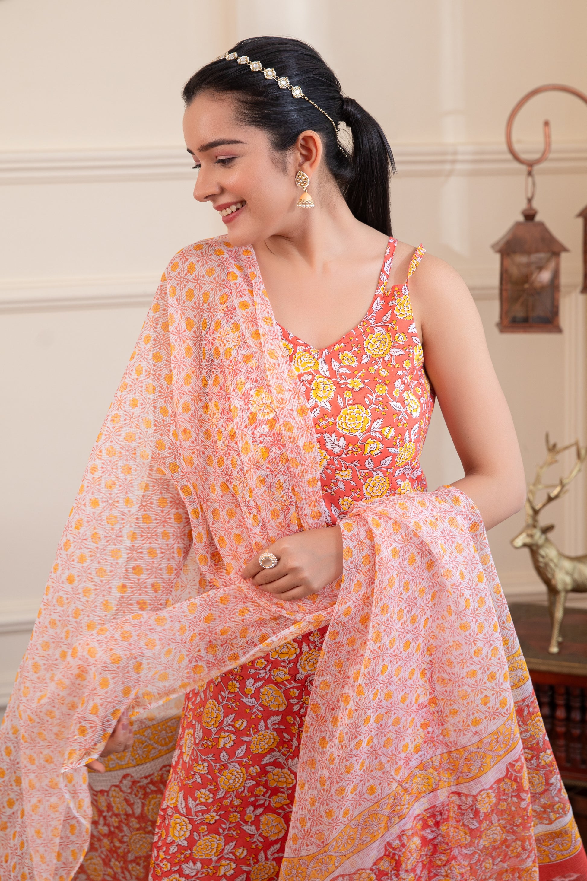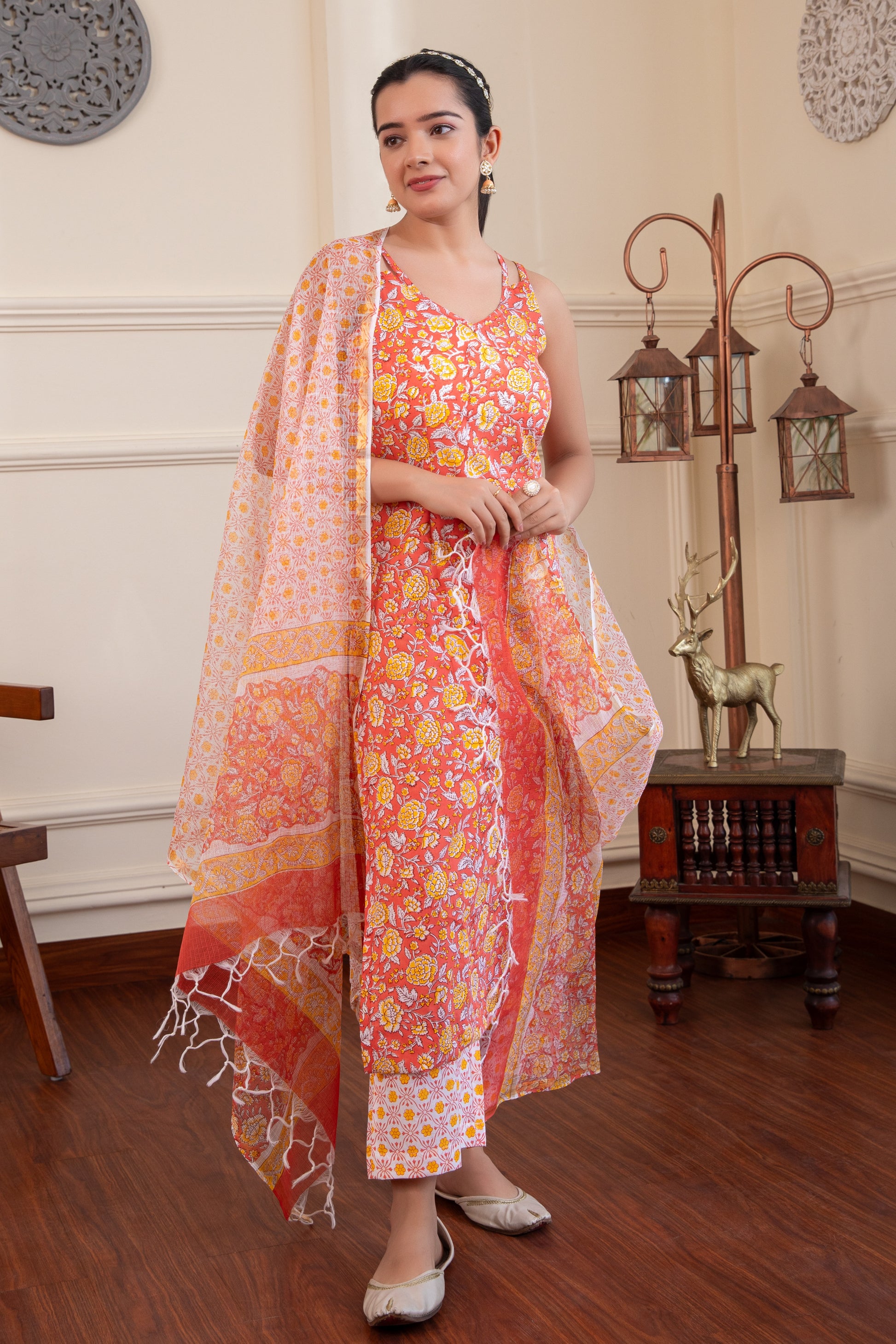 - Cotton Printed Straight Kurta with Palazzo and Kota Doria Dupatta