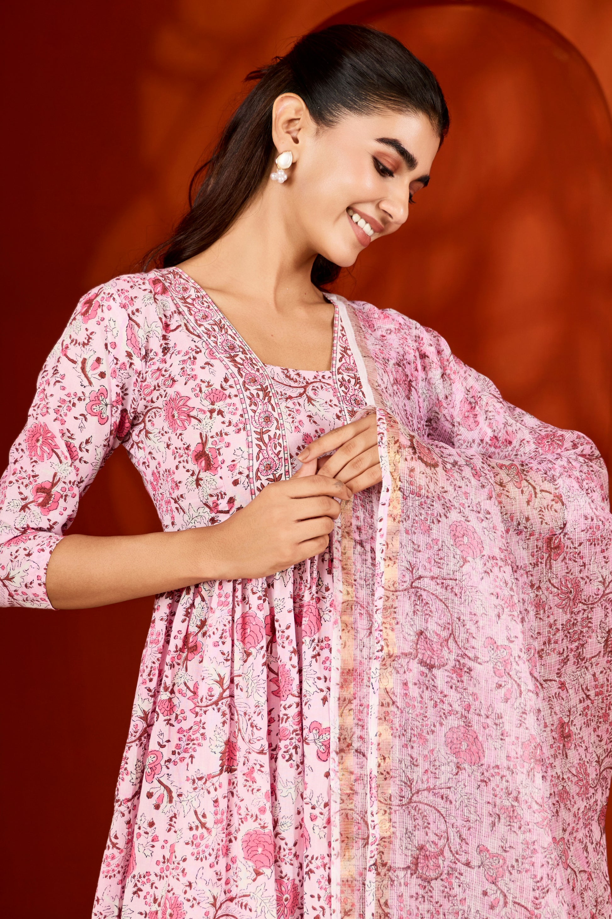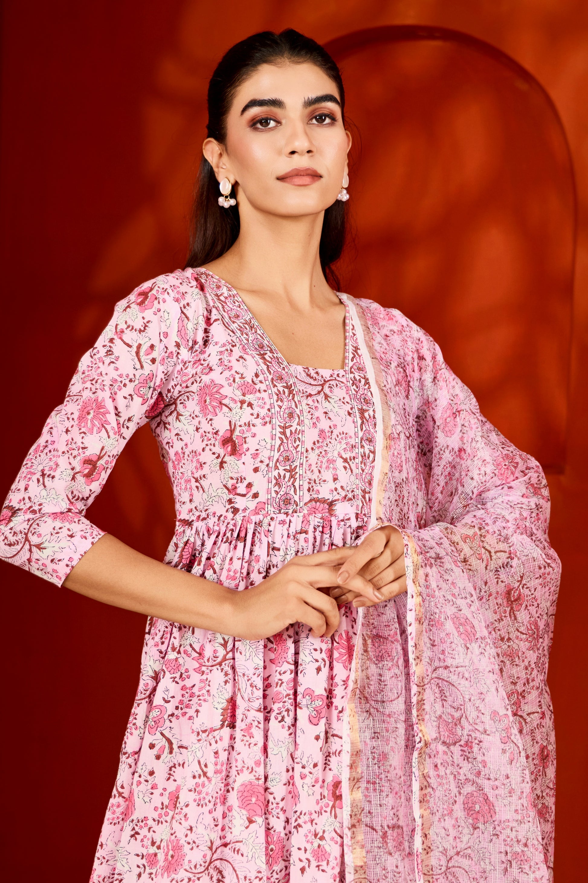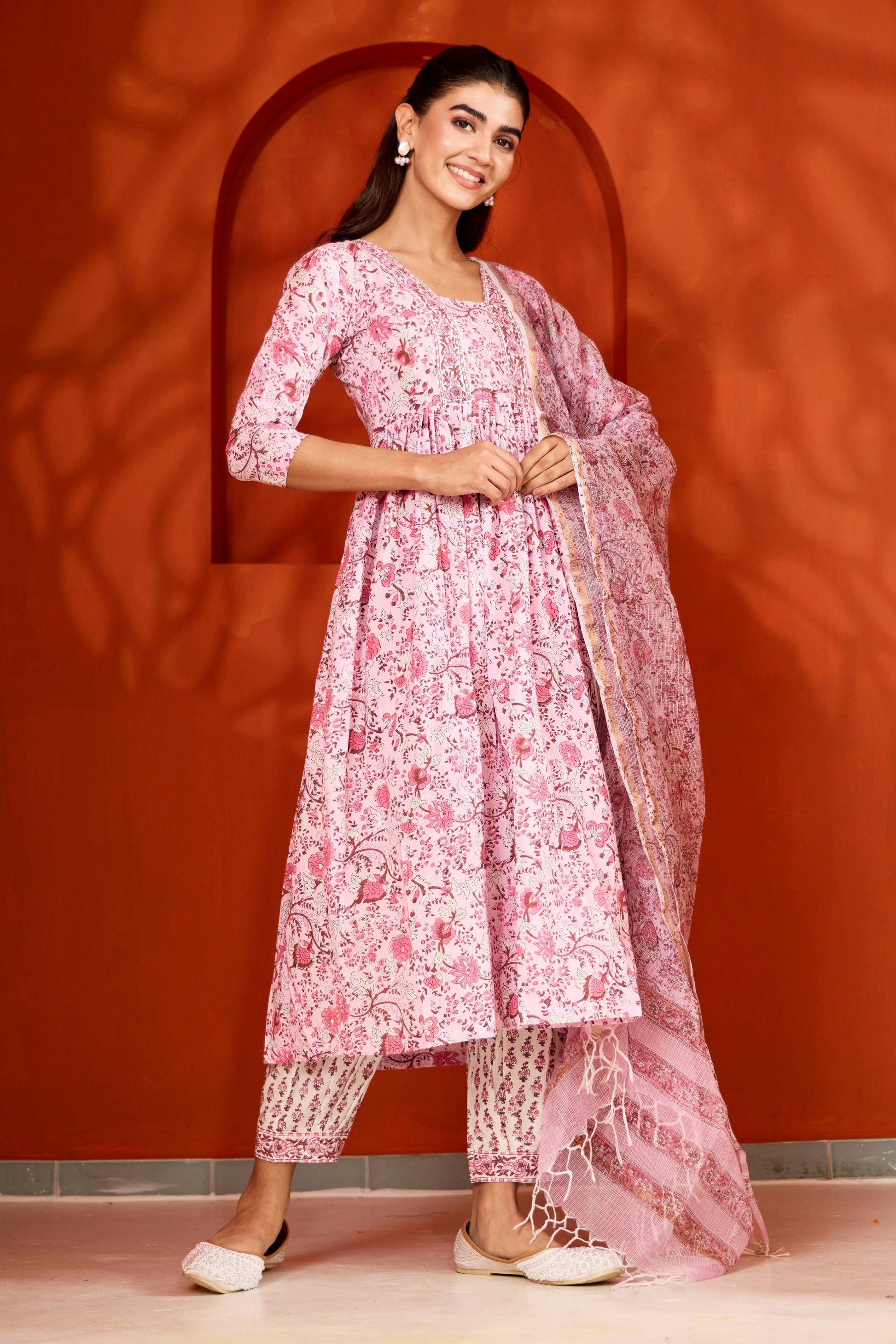 Pink & White Hand Block Printed Suit (Set of 3)