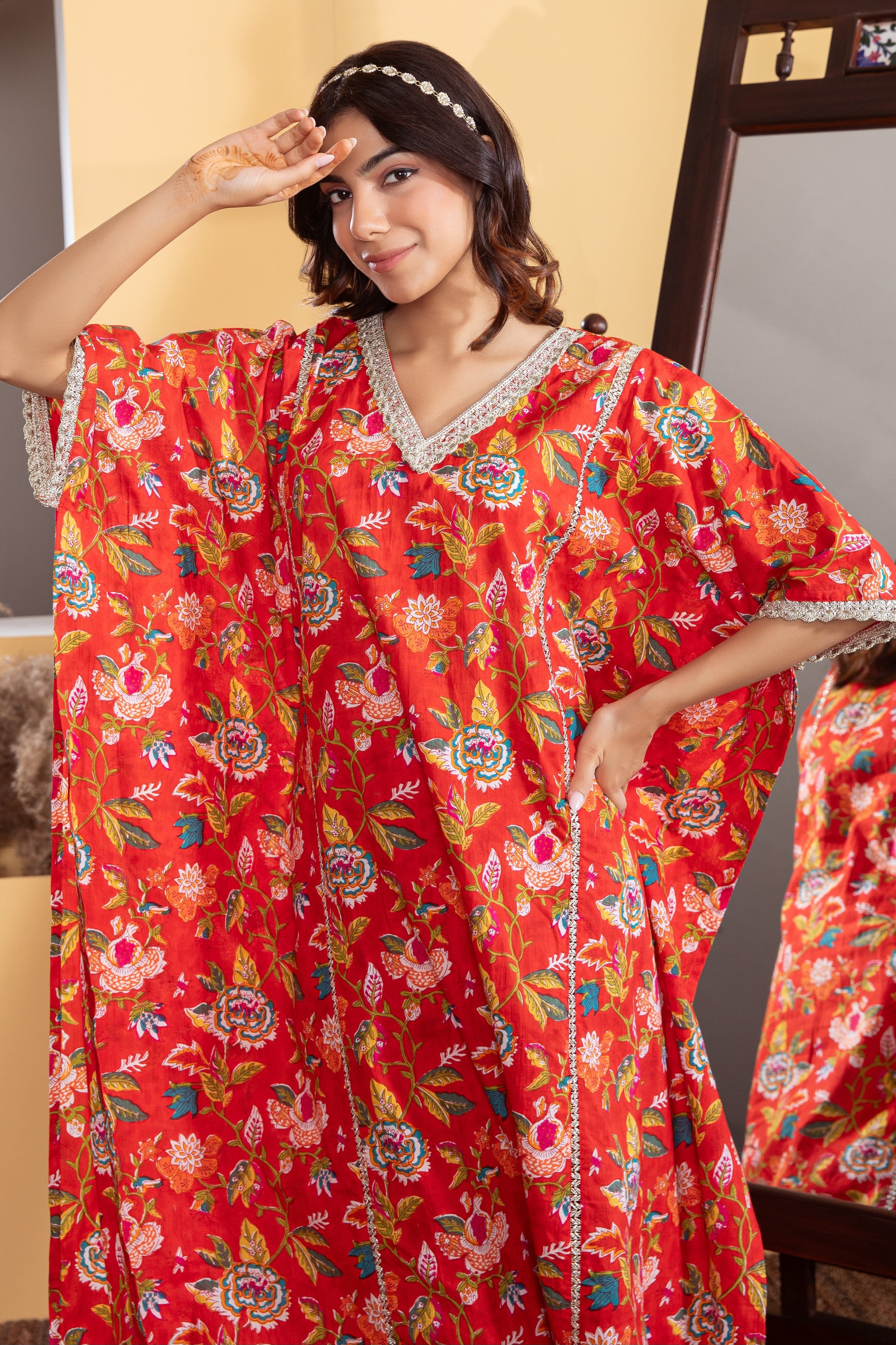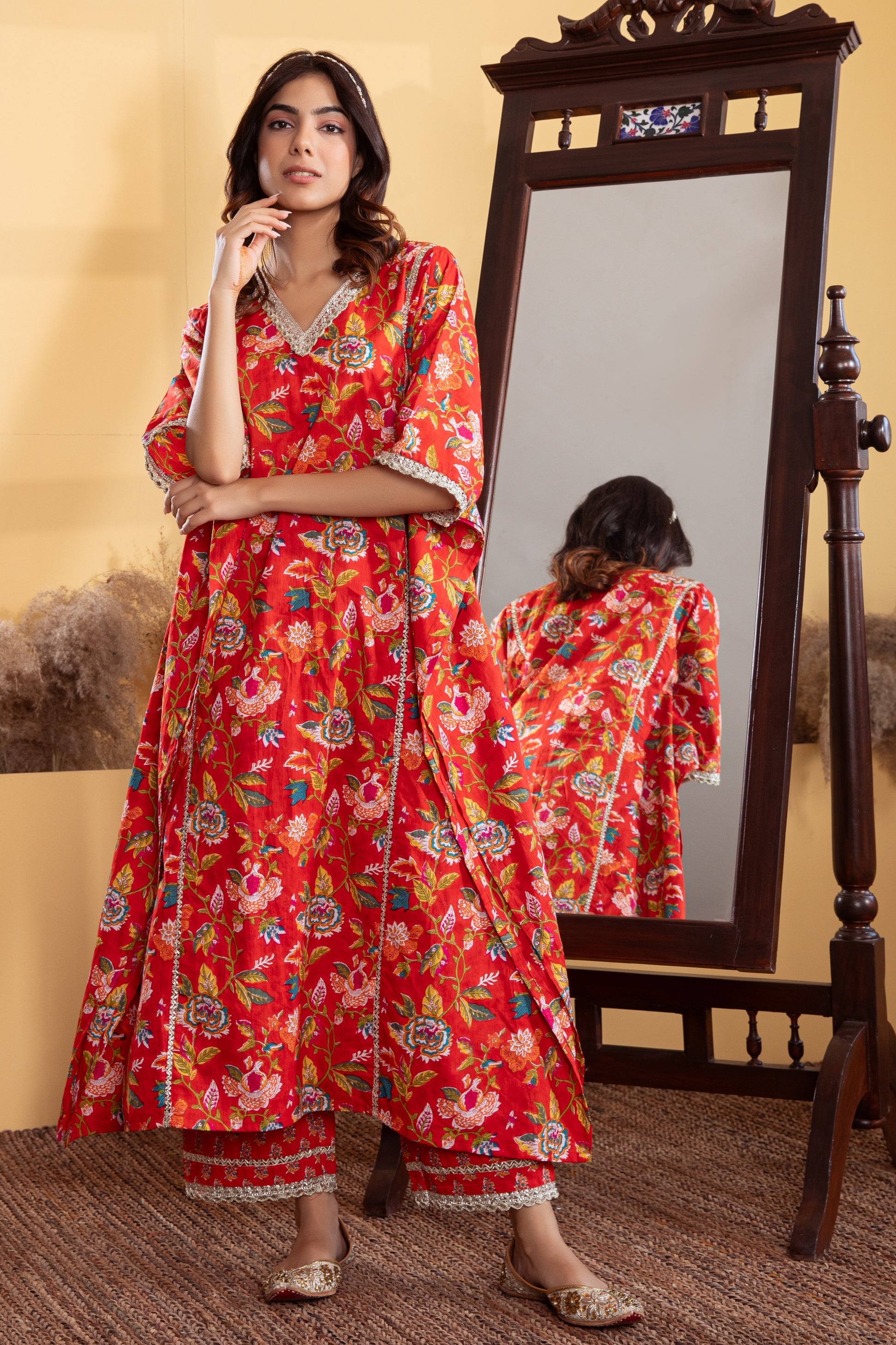 Red Cotton Printed Kaftan with Palazzo (Set of 2)