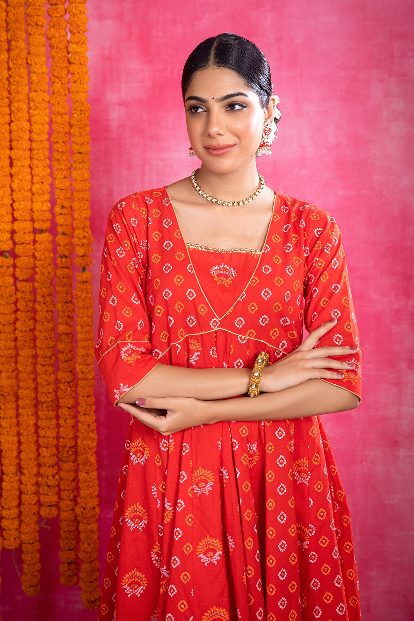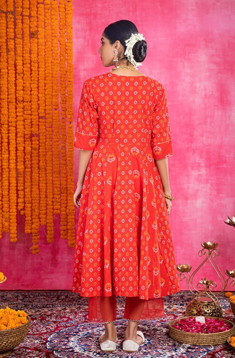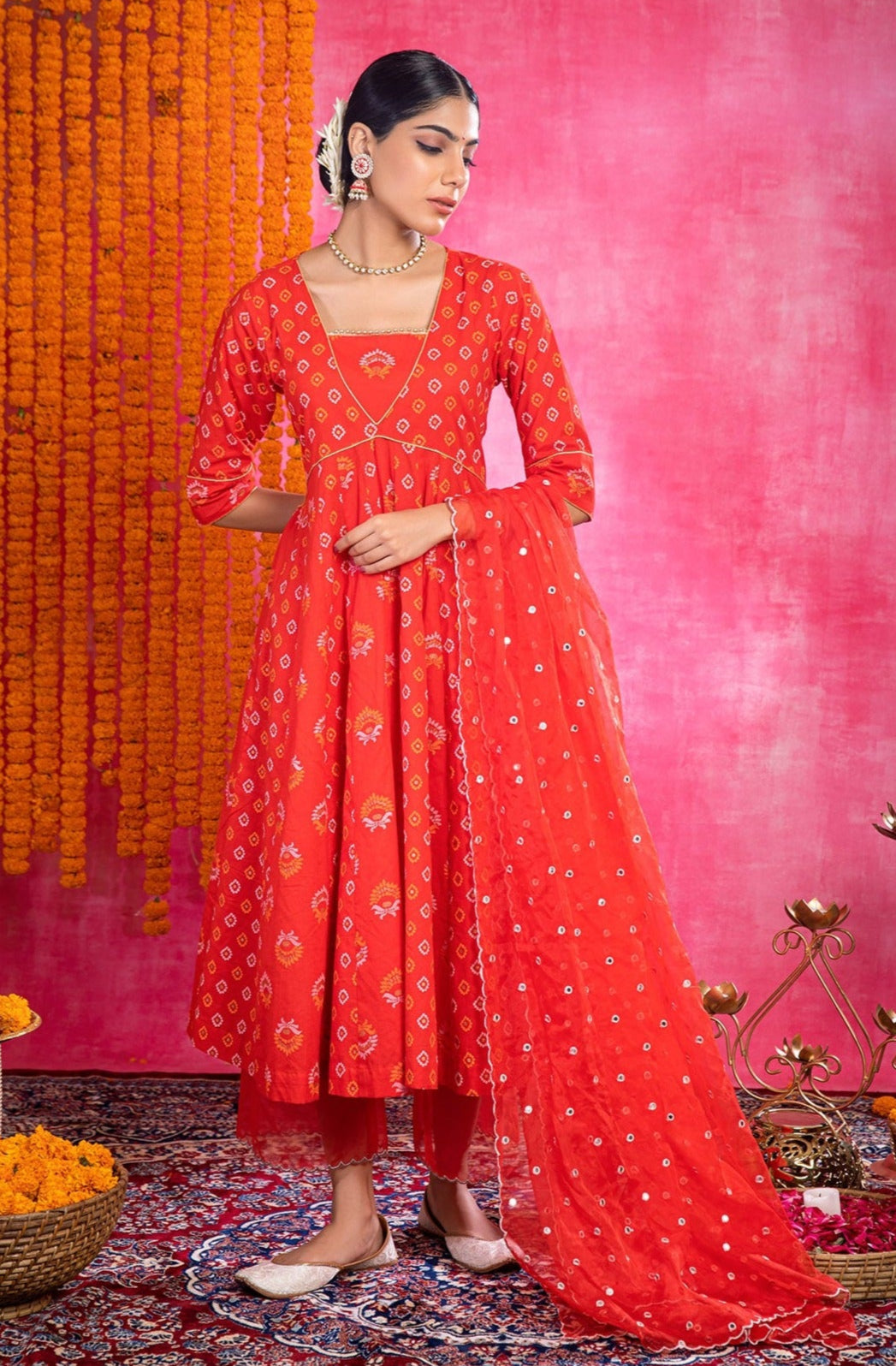 Red Cotton Printed Suit with Organza Dupatta (Set of 3)