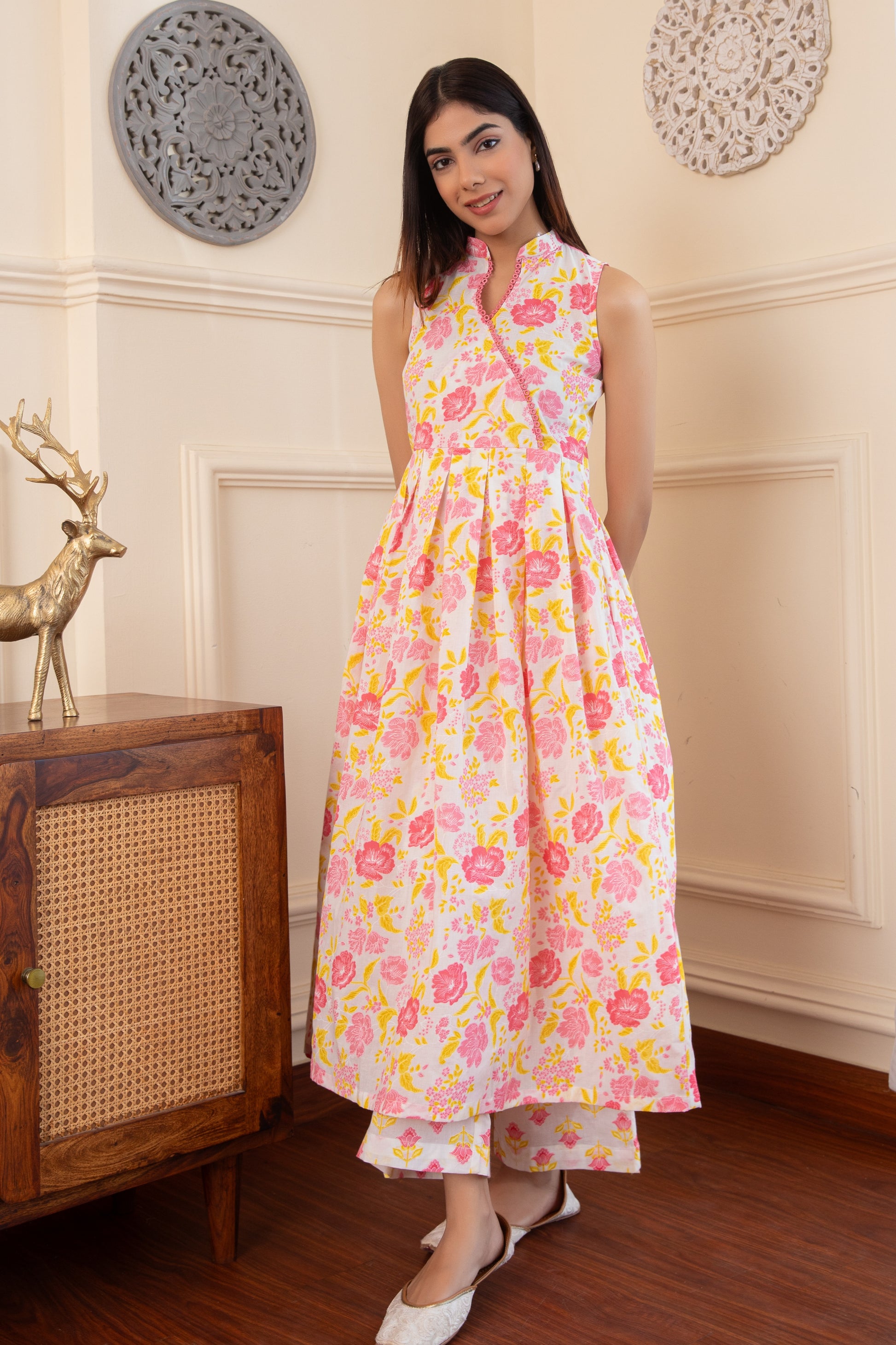 White & Pink Box Pleated Kurta with Palazzo (Set of 2)